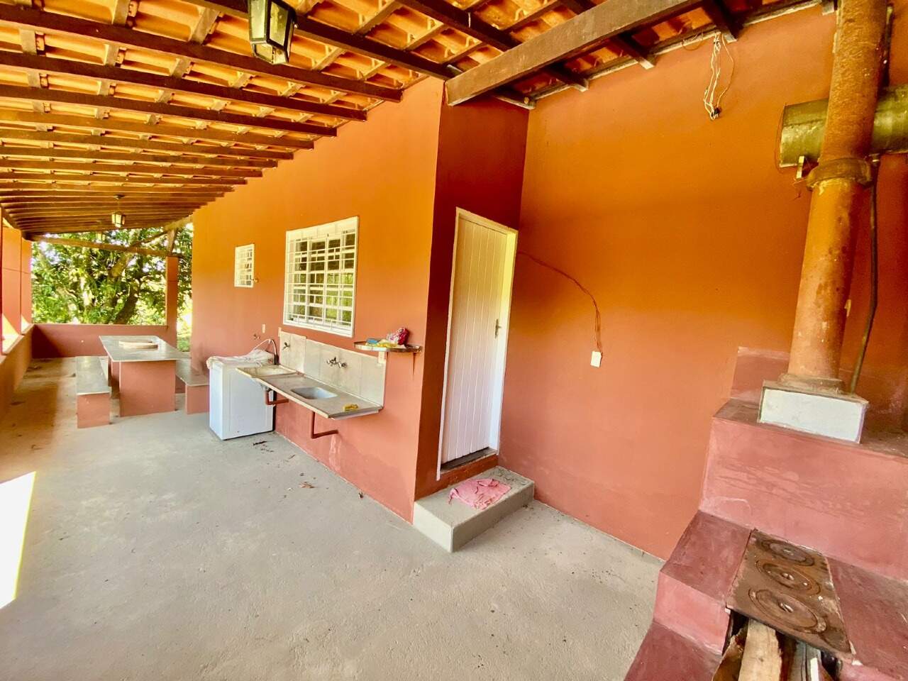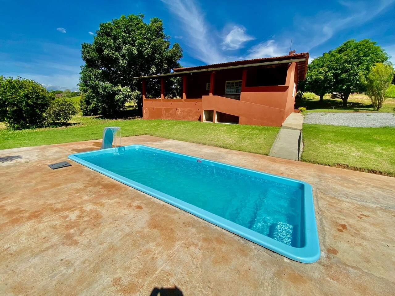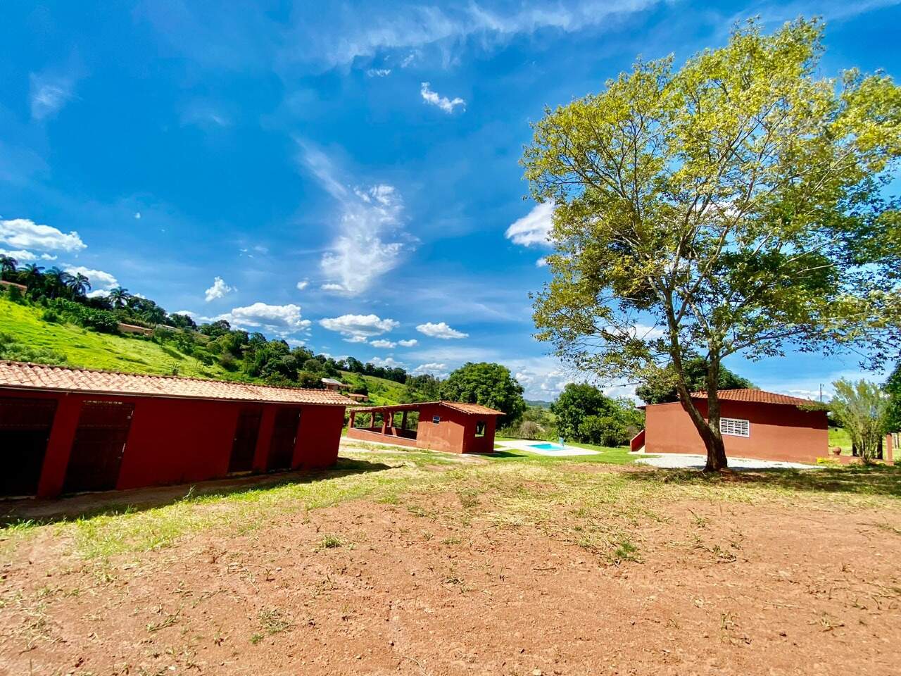 A propriedade conta com área gourmet com piscina, baias para cavalos e fogão à lenha, proporcionando conforto e lazer em meio à natureza.