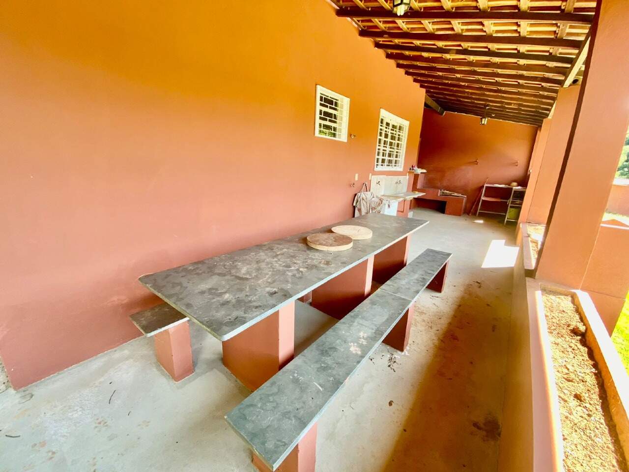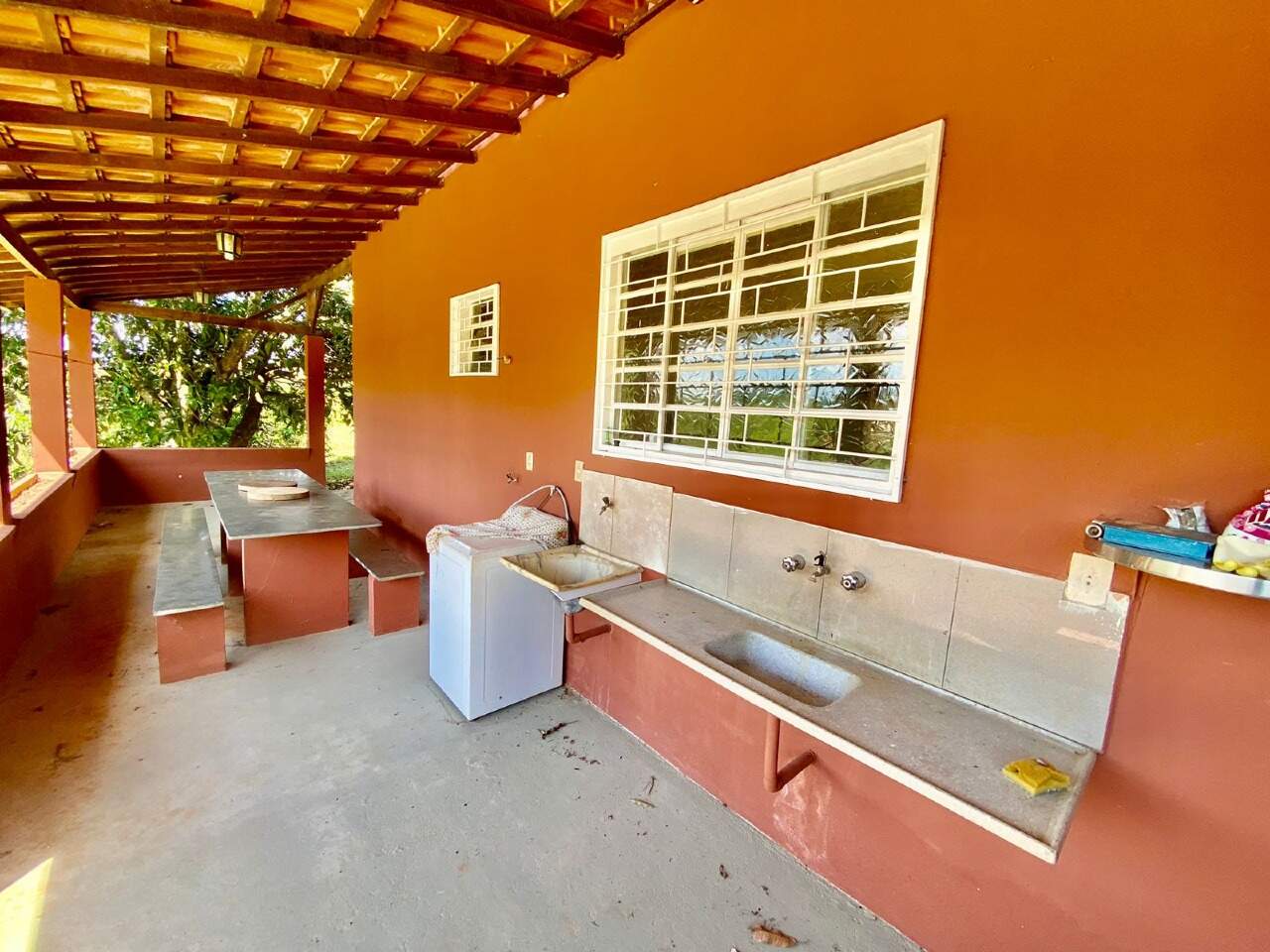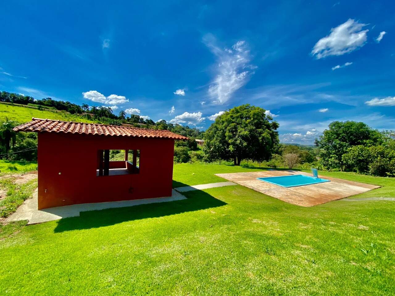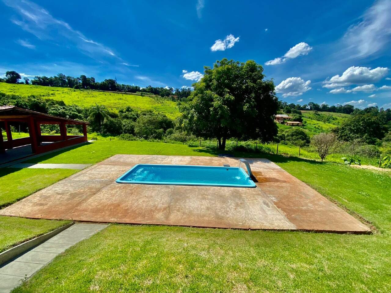 A propriedade conta com área gourmet com piscina, baias para cavalos e fogão à lenha, proporcionando conforto e lazer em meio à natureza.